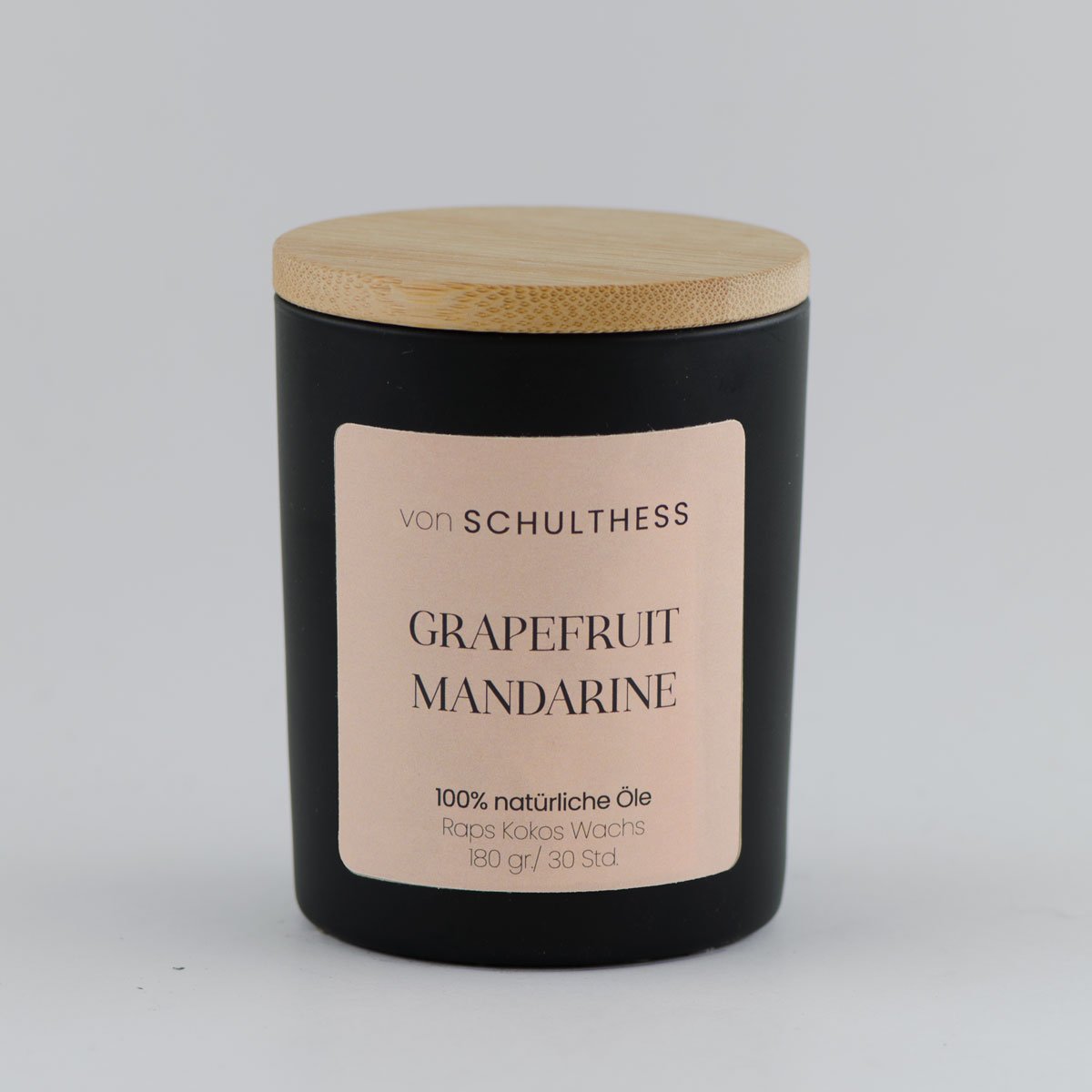 Duftkerzen im schlichten Schwarzglas mit Bambusdeckel mit 100% natürlichen Essenzen.